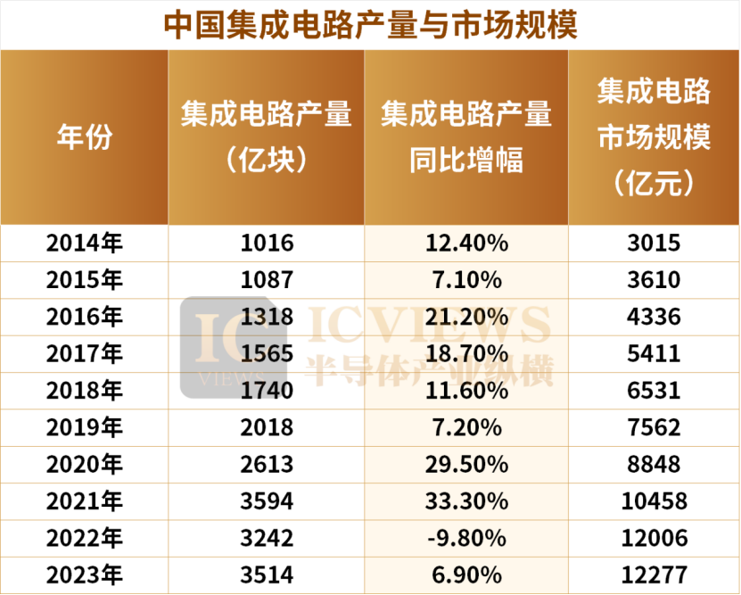 集成电路作为信息技术的核心,已成为竞争力的关键要素。面对这一趋势,国内正以前所未有的决心和力度,加大本土集成电路产业的发展步伐。上图所示,自2014年以来,中国集成电路产业市场规模一路攀升,集成电路产量也快速增加。之后在2020年与2021年前后迎来高速上涨,产量同比增长率达29.5%、33.3%。与进出口数量境遇相似,2022年中国集成电路产量也迎来微微下滑,随后在2023年再次恢复上涨趋势。不过总的来说,最近十年中国集成电路产量的复合年增长率依旧远超全球平均增长水平。